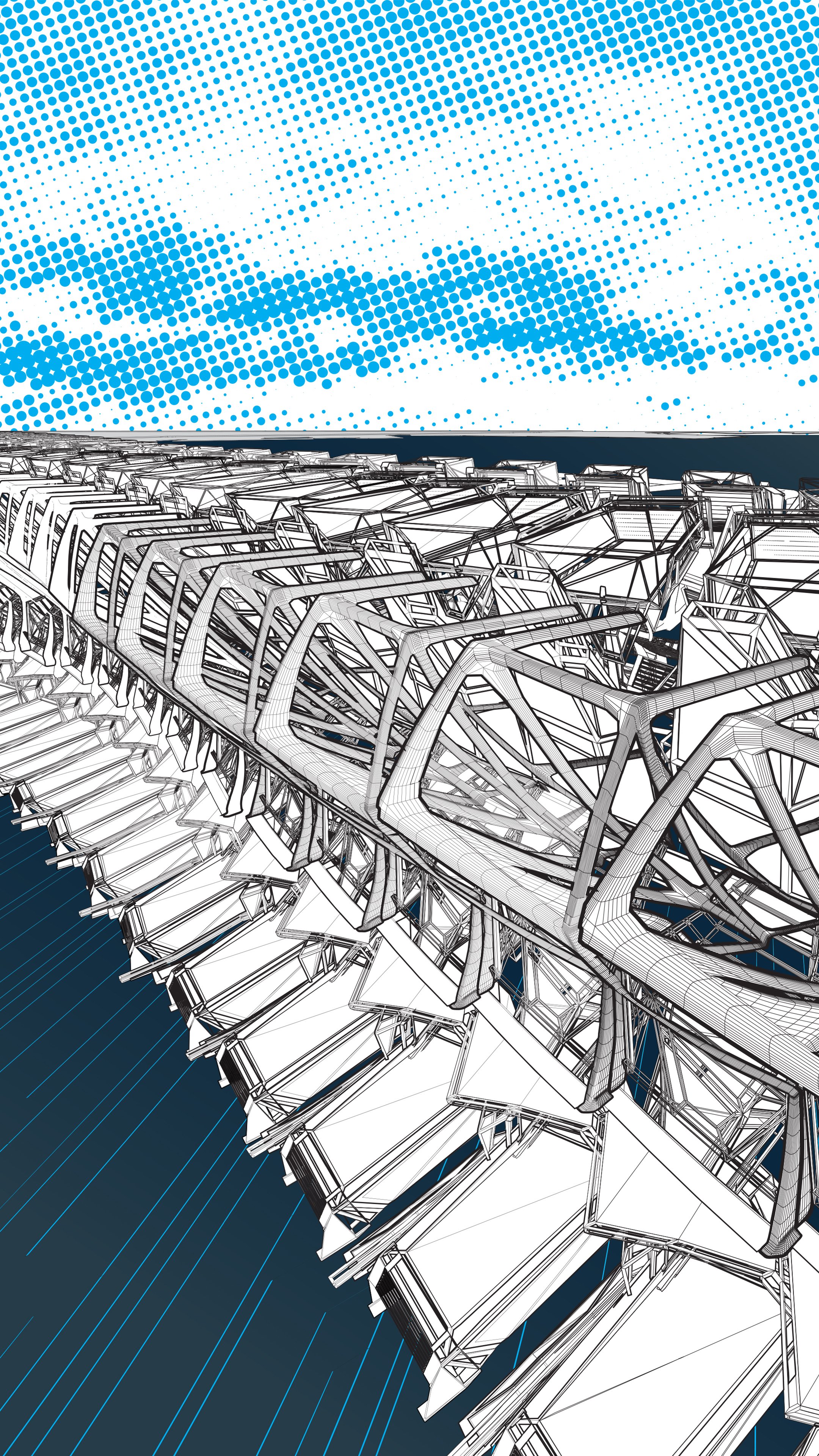 This megastructure, located on Tokyo Bay, serves to resuscitate Japan’s Gross Domestic Cool. It is architecture as an instrument for a proactive cultural recovery in a devastated Japan, ravaged by a fictional war. From the smallest irreducible units, with their programmable surfaces, to the 300-meter tall structural frames, this architecture moves in all scales: both for effect and functional freedom. These movements serve to constantly renew the half-life of the atmosphere of cool.